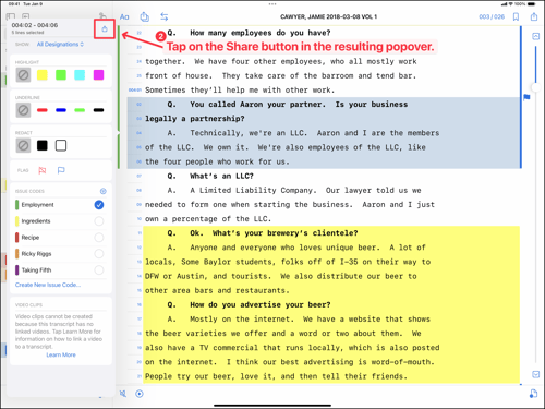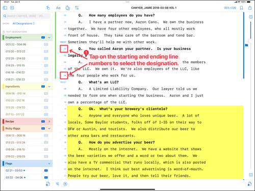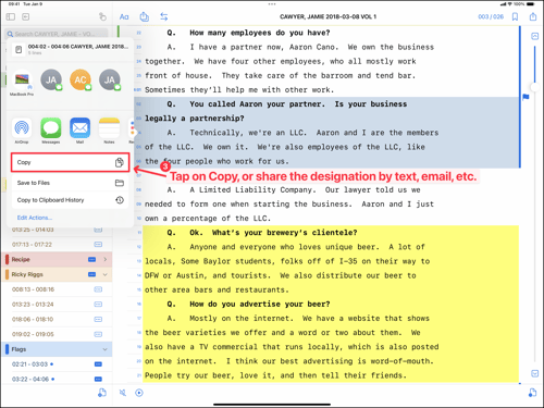 You can copy designations from a deposition or trial transcript in TranscriptPad and paste them anywhere while keeping their page and line numbers. Paste directly into a motion draft or a slide for closing argument, or share them in an email or text message.