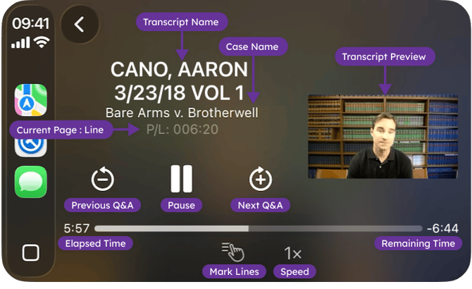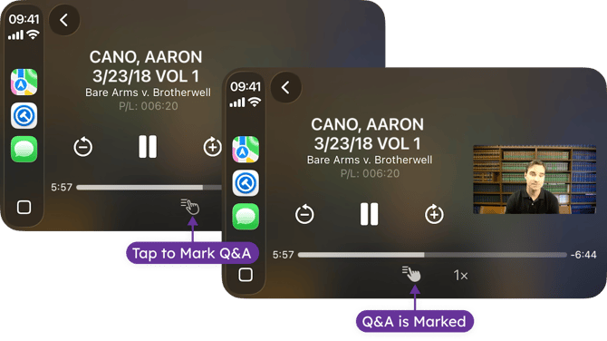 Marked Lines lets you save key testimony with a single tap on the CarPlay display. Tap the Marked Lines button while your transcript is playing, to mark the question and answer you are listening to for later review. Tap again to undo.