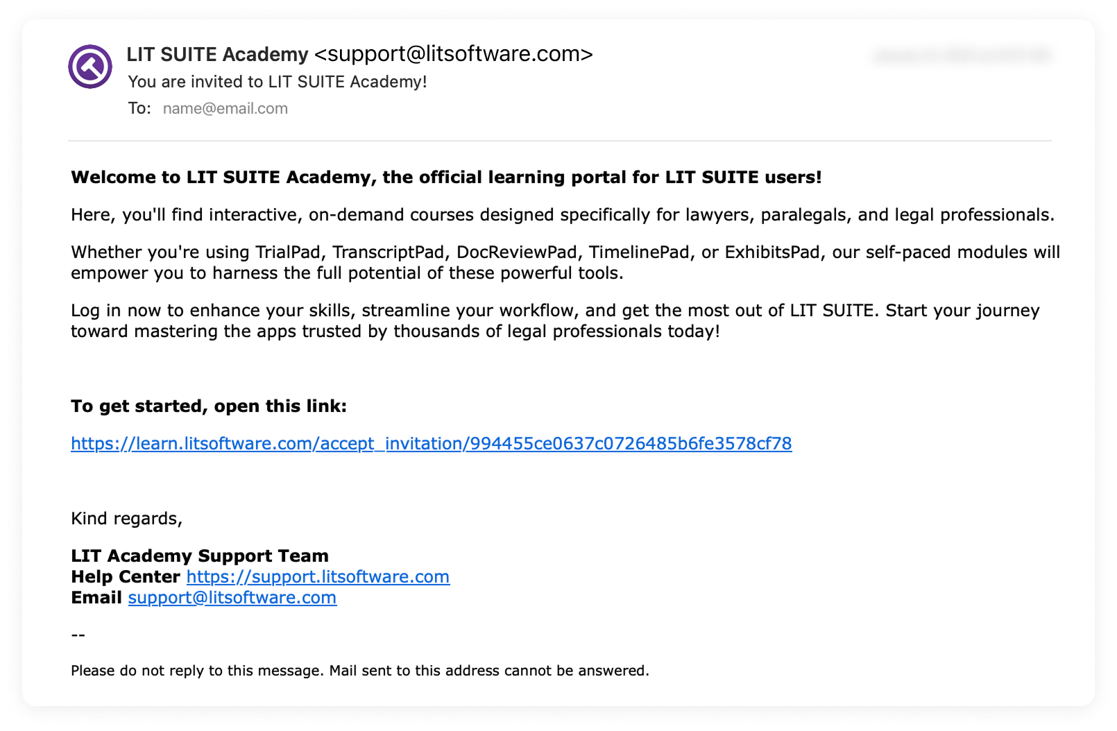 You'll be sent an email to the email address provided with the subject “You are invited to LIT SUITE Academy” and a link to finish registration.