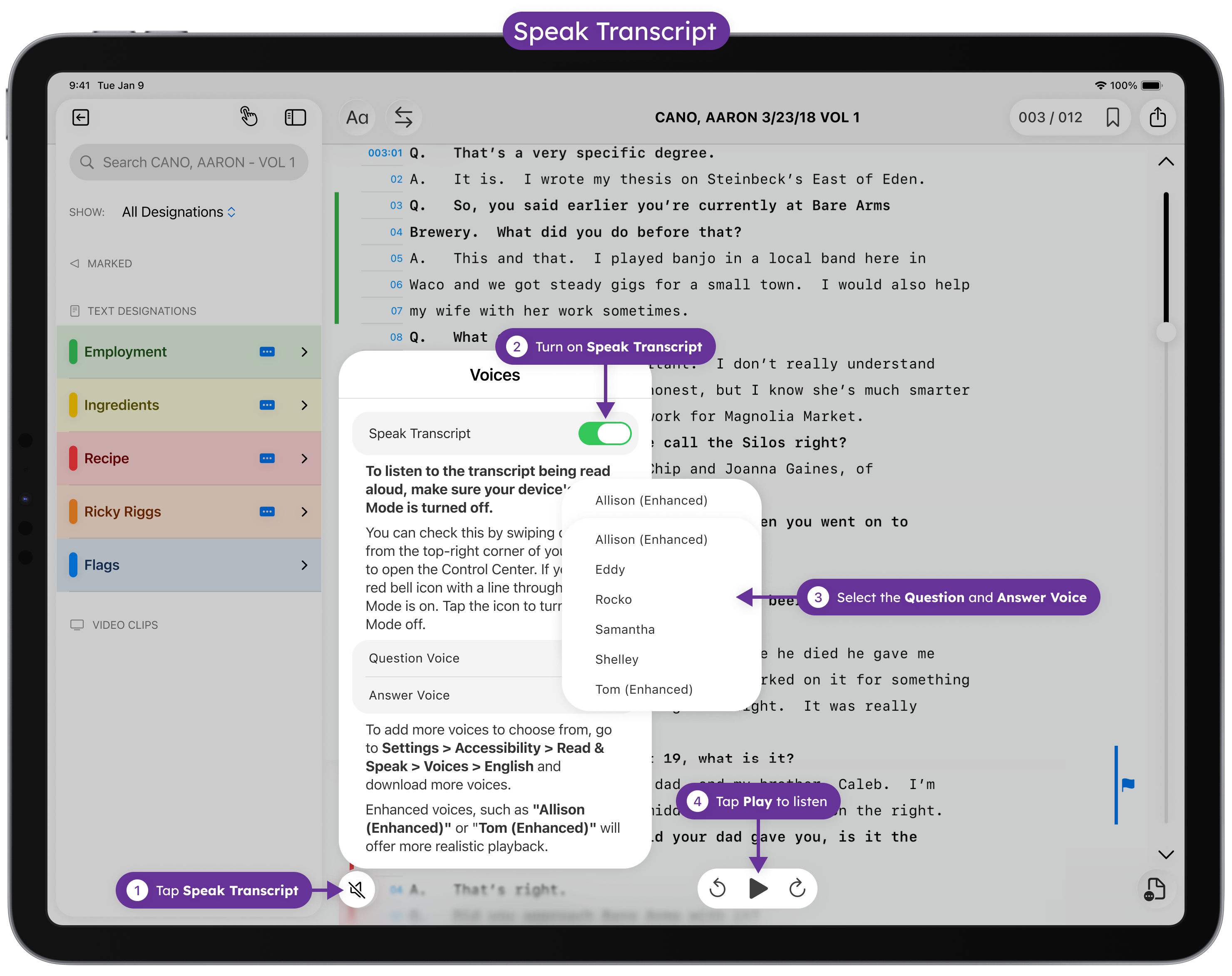 Whether you’re reviewing deposition testimony on the go, multitasking while prepping for trial, or simply prefer hearing the content aloud, TranscriptPad’s Speak Transcript feature can make a big impact.